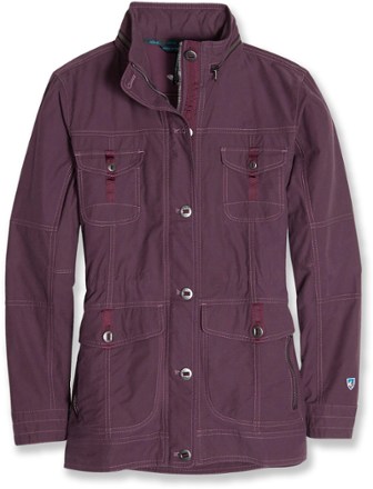 Durable and soft the women s kuhl rekon jacket offers casual hip length style with a stowable hood and plenty of pockets for your urban rambles.